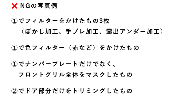 ナンバープレート、人物が写り込んでいる写真の場合、ナンバーや人物の顔などを隠すための加工をしていただいても構いません。