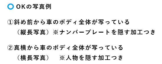 ななめ前、または真横から撮影された「ボディ全体が収まっている」写真をご用意ください。